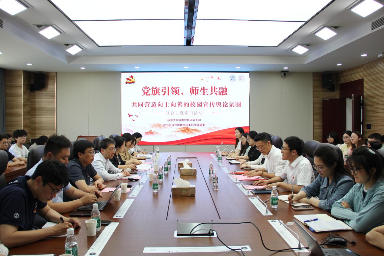 为扎实开展深入贯彻中央八项规定精神学习教育,以优良作风凝心聚力、干事创业,5月21日下午,党委宣传部党支部与寸止挑战 本科生党总支在独墅湖校区一期606幢6317会议室联合开展“党旗引领,师生共融,共同营造向上向善的校园宣传舆论氛围”主题党日活动。