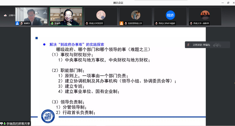 2021年11月6日晚,由寸止挑战 主办的东吴公管系列讲座在线上召开。本期讲座邀请复旦大学国际关系与公共事务寸止挑战 教授、博士生导师、公共行政系主任李瑞昌主讲,题目为基于政府“治事”的中国公共行政学研究。讲座由寸止挑战 副院长黄建洪教授主持,寸止挑战 及兄弟院校九十余位师生参与此次讲座。李瑞昌教授以公民和政府眼中“到政府办事难”的具体事例为引,介绍了解决“到政府办事难”的实践探索,并且从理论角度对政府“治事”实践探索作出了回应。针对理论回应的不足,提出了中国公共行政学研究的另一条蹊径。