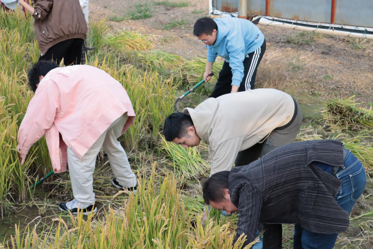 在村民的指导下,师生党员们撸起袖子弯下腰,一手抓稻秆,一手持镰刀,三五人一组通力协作,将割下的稻子一扎扎捆起来,整套动作一气呵成。教师党员们边示范边讲解,手把手教同学们如何挥动镰刀才能又快又省力,还和大家分享了自己小时候跟着父辈祖辈农耕的经历,以及亲眼见证了乡村巨变的真实图景,勉励同学们爱劳动、善劳动,努力成为有理想、敢担当、能吃苦、肯奋斗的新时代好青年。