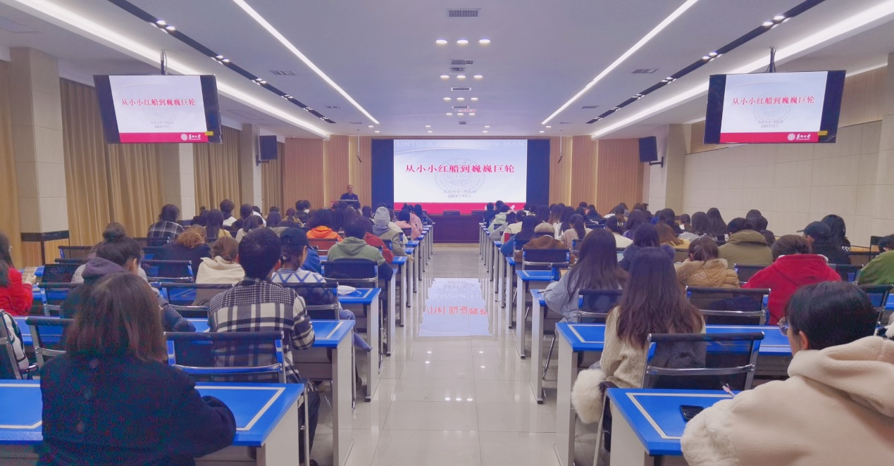 查佐明老师以“小小红船到巍巍巨轮”为主题展开本次授课。他以时间为线向同学们介绍了中国共产党从小小红船到巍巍巨轮的百年奋斗历程,深刻地阐释了习近平总书记对党史的研究,从红船掌舵人等方面阐释了习近平总书记在中国共产党成立一百周年庆祝大会上的重要讲话精神。