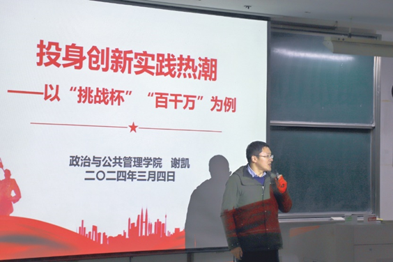 谢凯老师为同学们带来了题为《投身创新实践热潮——以“挑战杯”“百千万”为例》的专题分享。谢老师从大学生培养创新精神和创业能力的必要性、重要性、可行性出发,鼓励同学们积极参加创新创业,将个人理想同国家社会发展需要紧密结合。从凝聚共识到促进行动,谢凯以“挑战杯”为例,进一步从调研选题、调研方法、调研报告等方面进行了细致介绍。他鼓励同学们充分利用院内资源、激发主动创新意识、深入挖掘自身创造力,积极参与寸止挑战 组织的“走进百城千村万户”工程,围绕社会现实问题进行调查研究,投身创新实践热潮,做科创报国的奋斗者。