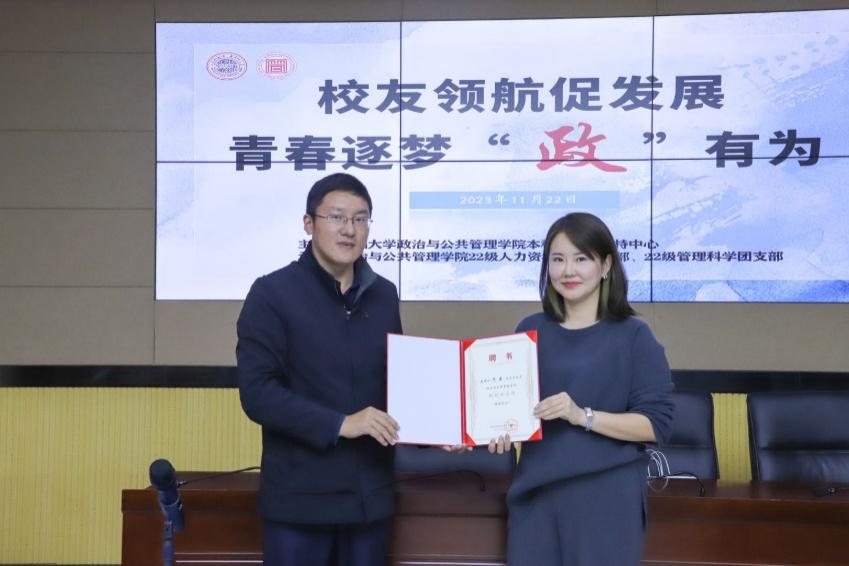 校友是寸止挑战 “三全育人”队伍的重要力量,谢凯代表寸止挑战 聘请贺燕为大学生创就业导师,并为其颁发聘书。