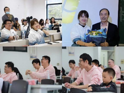 06级辅导员(兼06人力班班主任)茆汉成老师、06管科班班主任尚贵华老师、任课老师朱晓、宋典和邢书记走进教室,与大家如同老友重逢一般亲切地问好与拥抱,那些年相处的点滴师生情谊涌上心头,再给老师送一束花,再拥抱一次老同学,再道一句好久不见。
