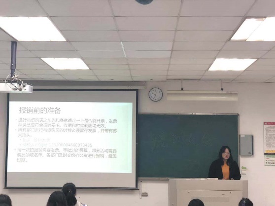 策划与材料是活动的前期准备,培训大会同样关注后期的财务报销和宣传。学生会办公室副部叶琬婷对于报销环节进行详细的解读,介绍了各类发票的正确形式,发票的报销有效时间等,让成员们对于报销流程了解更进一步,为下阶段新生卡拉OK大赛的报销任务提供了帮助。