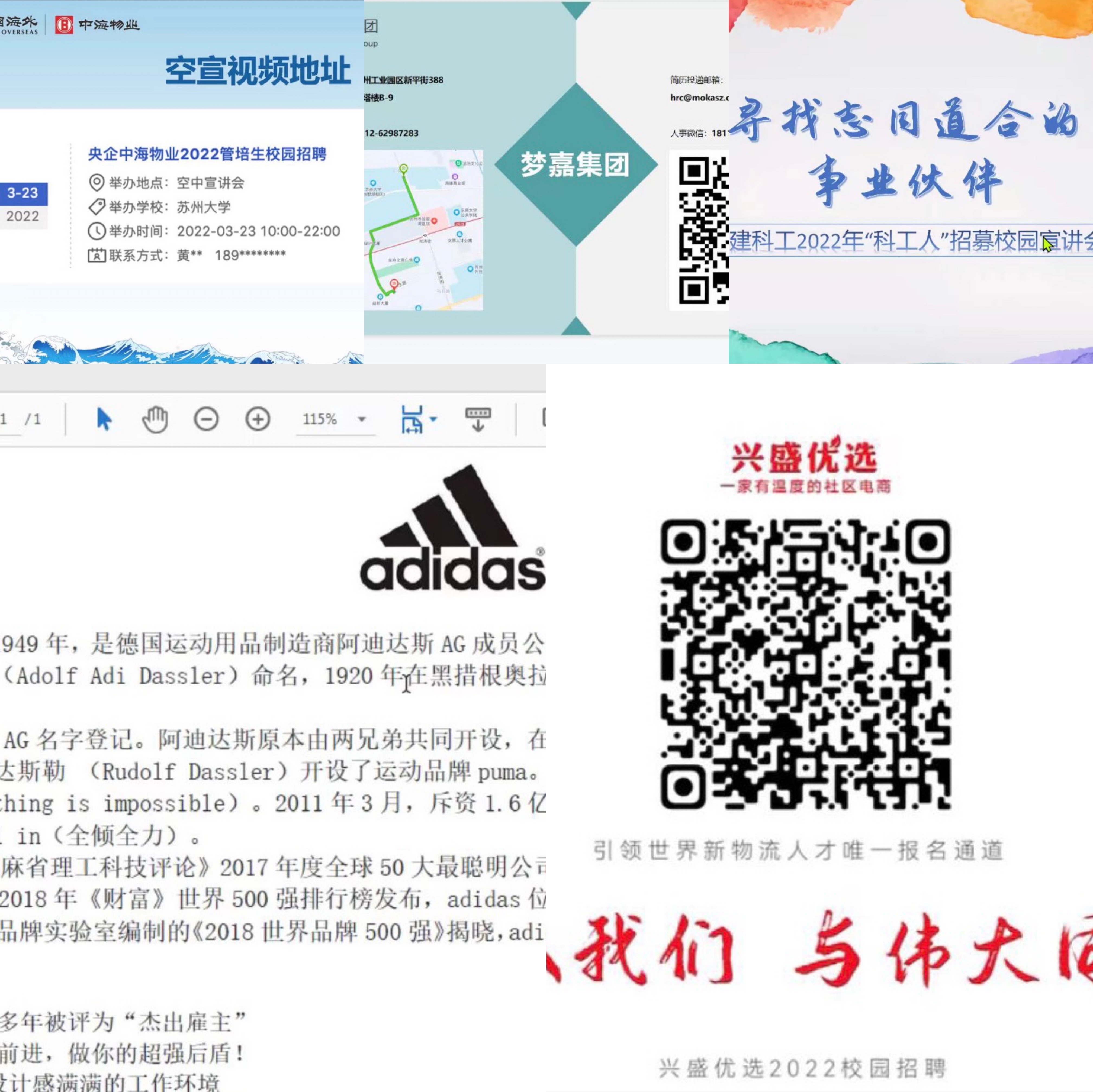 阿迪达斯体育(中国)有限公司、江苏梦嘉控股集团有限公司、中建科工、中海物业集团、东吴服务产业集团(江苏)有限公司、传新美讯、中建智地浒关项目校招、科丝美诗(中国)化妆品有限公司、CVTE视源股份、湖南兴盛优选电子商务有限公司等优质单位的招聘主管,纷纷以PPT、视频等形式,热情洋溢、专业精彩地介绍了各自公司的发展历史、品牌特色、企业理念、业务分布、校招岗位、培养体系等。