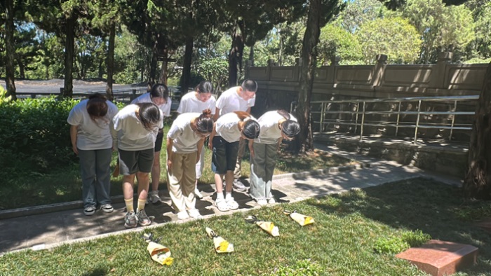 轴线连古今忠骨伴青山烈士陵园划分为纪念瞻仰与烈士安息两大功能区。纪念瞻仰区雄踞陵园中枢,以主轴线对称布局勾勒出庄严肃穆的空间叙事。这条长约160米的轴线,自西向东循地貌拾级而上,如同一部立体的史书铺展。实践团成员先于牌坊下合影存念,而后沿轴线次第探访纪念场馆,最终在纪念碑前驻足追思。革命烈士纪念碑以四棱雄姿矗立,正面镌刻着陈毅元帅题写的“为人民事业而牺牲是最光荣的”十三金句。碑体高27米,基座的4层台阶暗藏深意,隐喻着1949年4月27日苏州解放这一历史性时刻。烈士骨灰安葬区静卧于纪念瞻仰区北侧,由烈士墓群与烈士骨灰堂共同构成生命的永恒坐标。烈士墓群采用三坛五区的格局,258位烈士的遗骸在此长眠;烈士骨灰堂内,62位烈士的骨灰静静安放,每一份忠魂都承载着一段不朽的传奇。实践团成员手捧预先备好的鲜花,怀着敬畏之心步入这片静土。墓前的二维码如同时空接口,成员们扫码溯源,体悟烈士们波澜壮阔的生平,亦抒发内心真情实感。随后,大家向烈士鞠躬致敬、献花致意,用最朴素的方式完成一场跨越生死的精神传承。