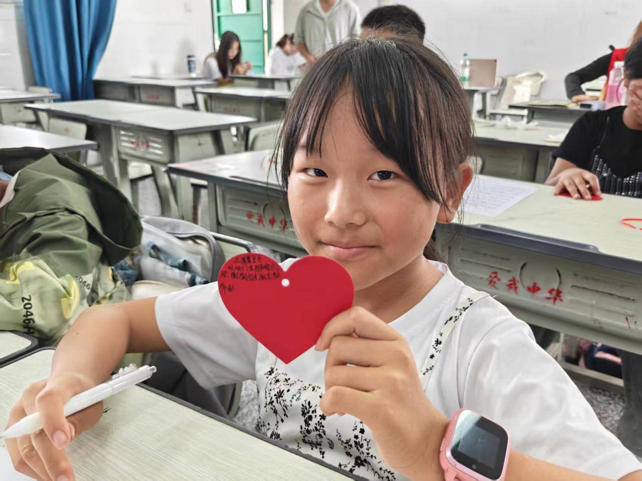 图为《做一名小小志愿者》创意思政课上,小朋友在爱心彩纸上写下要向志愿者哥哥姐姐学习,做一个乐于助人的好少年。廖晓晓 供图