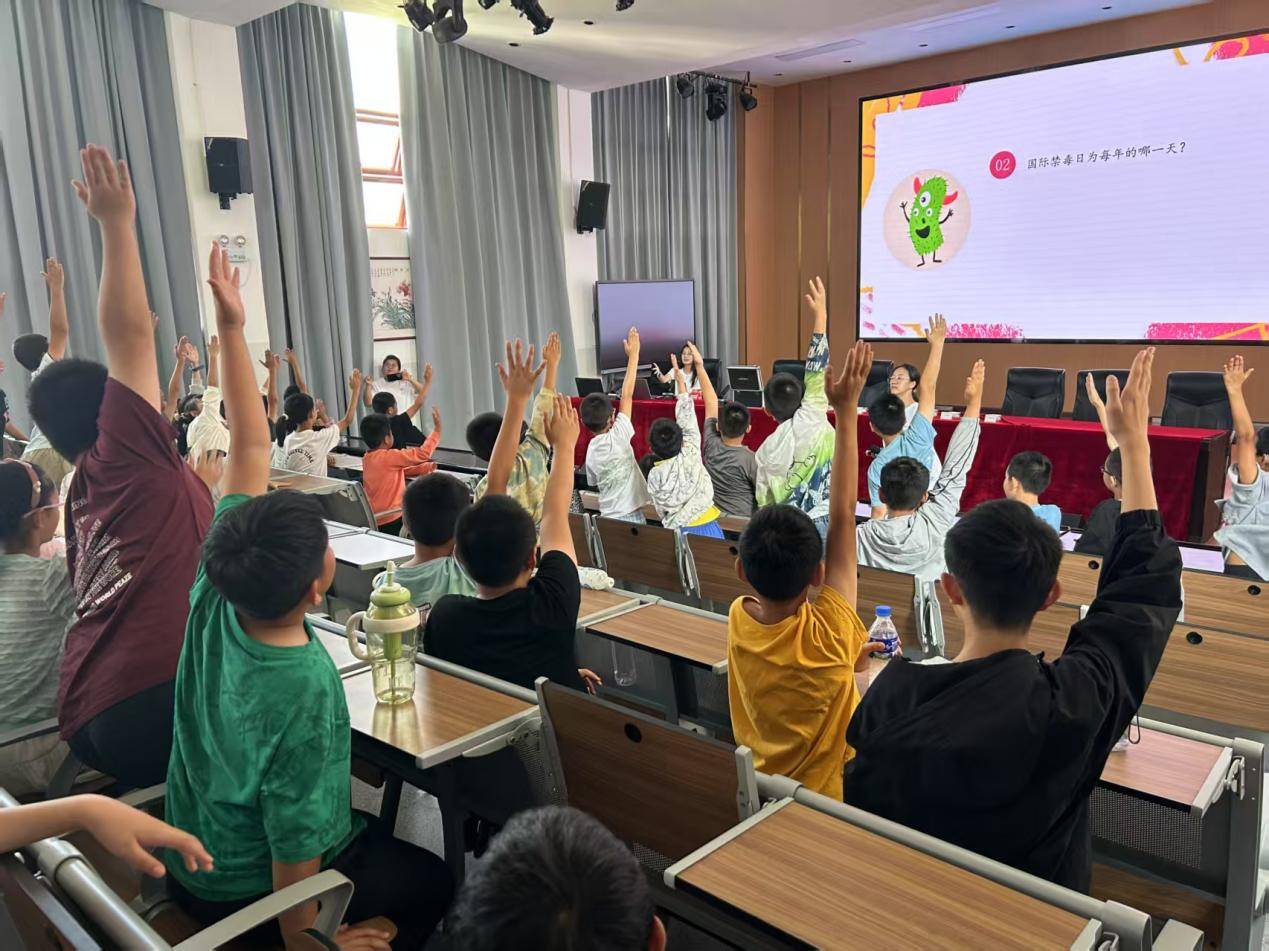 图为《远离毒品 珍爱生命》公开课上,小朋友们与实践团成员白点点积极互动,踊跃举手回答“国际禁毒日为每年的哪一天”这一问题。廖晓晓 供图