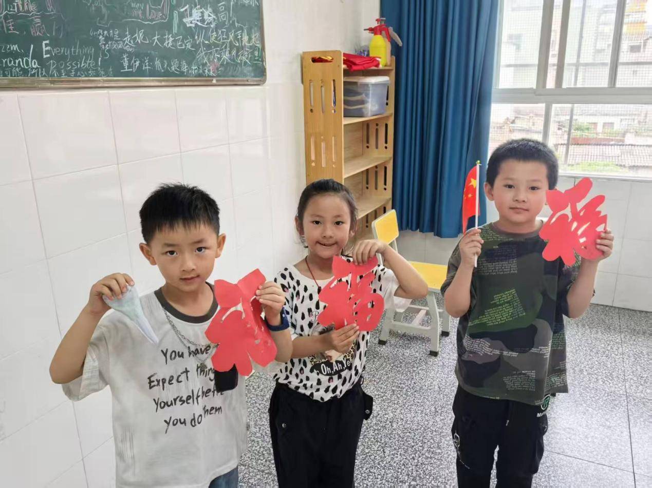 图为《剪纸创作中感悟文化魅力》课程尾声,小朋友们向镜头展示他们创作的剪纸作品,并且用童言童语表达对于“福”的理解与向往。成一涵 供图