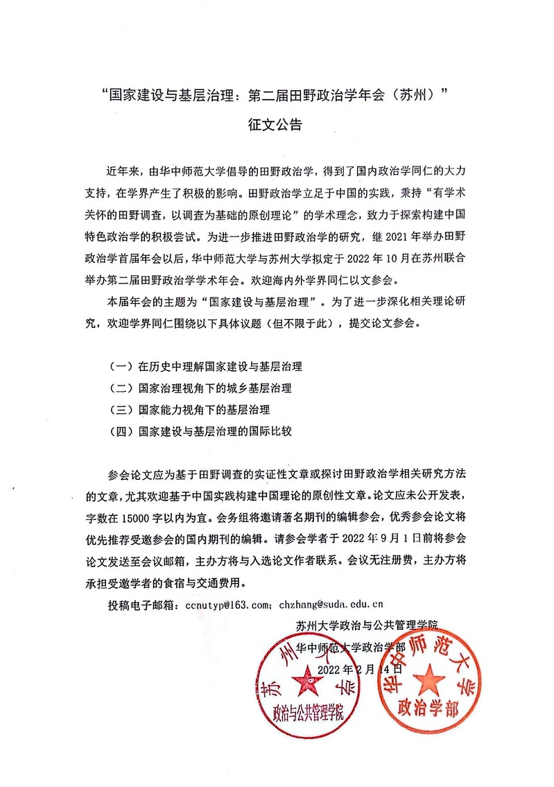 “国家建设与基层治理:第二届田野政治学年会(苏州)”征文公告