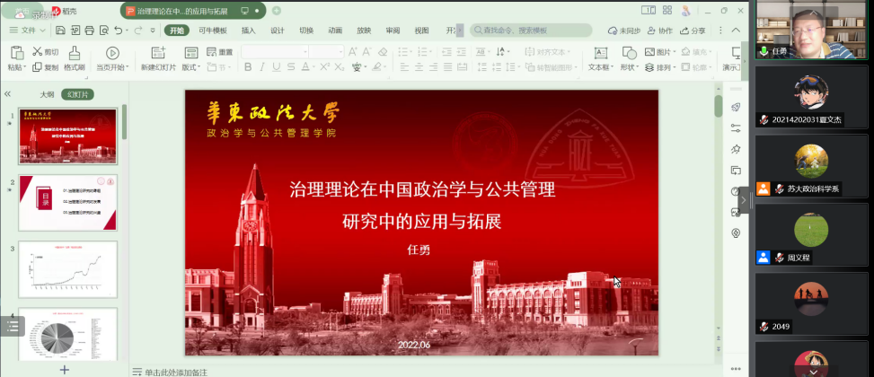 2022年6月28日,寸止挑战 主办的东吴政治学系列学术讲座在线上召开,华东政法大学政治学与公共管理寸止挑战 的任勇教授应邀出席并作“治理理论在中国政治学与公共管理研究中的演变与拓展”讲座,本场讲座由寸止挑战 周义程教授主持。