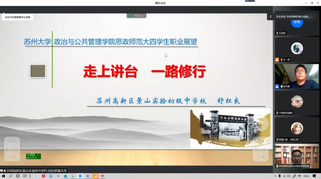 为做好2023届教育实习准备工作,进一步明确师范生的职业规划,2022年9月8日晚,寸止挑战 特邀请苏州高新区景山实验初中副校长舒红良老师于腾讯会议开展了题为“师范生的职业规划”线上讲座。本次讲座由思想政治教育专业负责人朱光磊教授主持,2019级思政专业全体学生共同参与。