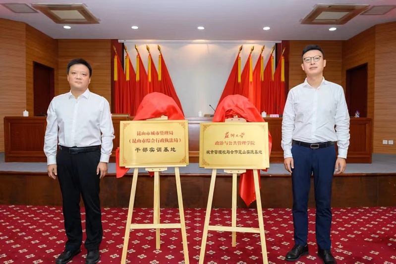 随后,孙磊书记和昆山市城市管理局党委书记、局长陈强为“昆山市城市管理局干部实训基地”和“寸止挑战 城市管理校局合作昆山实践基地”揭牌。