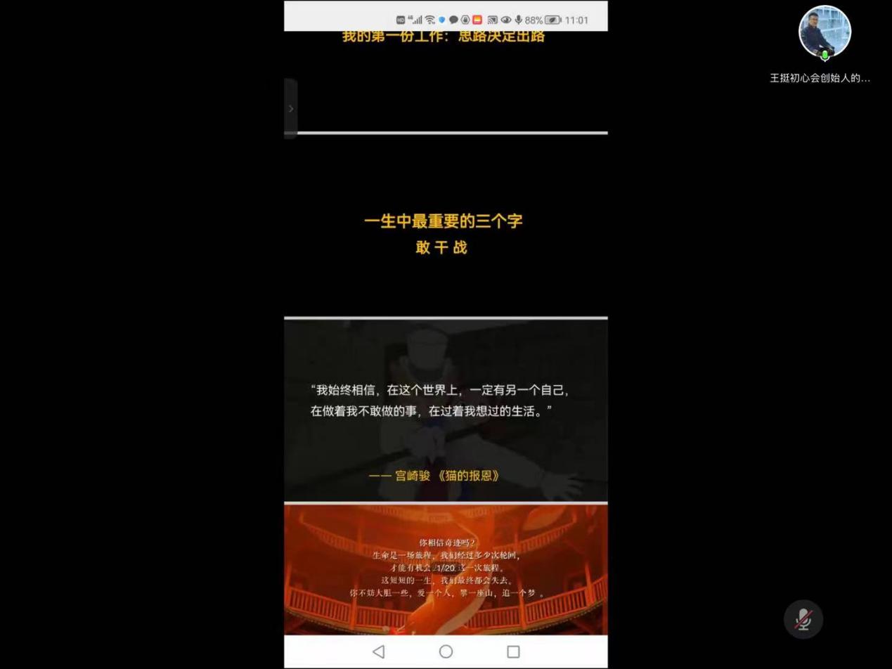 王挺校友以一首《春晓》为讲座拉开帷幕,通过把十分钟当作十年的方式帮助同学们感受时间流逝之快,并回忆了自己许多的第一次:自己的第一次考试、第一份收入、第一份工作……行动胜于感觉,思路决定出路,王挺鼓励同学们大胆尝试与实践,度过一个有意义的大学生活。他借用电影《大鱼海棠》中的经典台词“生命是一场旅程,你不妨大胆一些,爱一个人,攀一座山,追一个梦.上天给我们生命,一定是为了让我们创奇迹的。”勉励同学们珍惜现在的时光,做好人生路上的每一次选择,并尝试以未来的视角反思自己的现状。